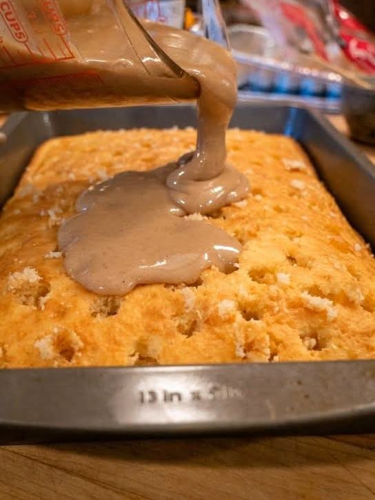Slowly pour the cinnamon filling over the cake, making sure it seeps into all the poked holes. Use a spatula to gently spread it evenly across the surface. Allow the cake to absorb the filling for at least 10–15 minutes.