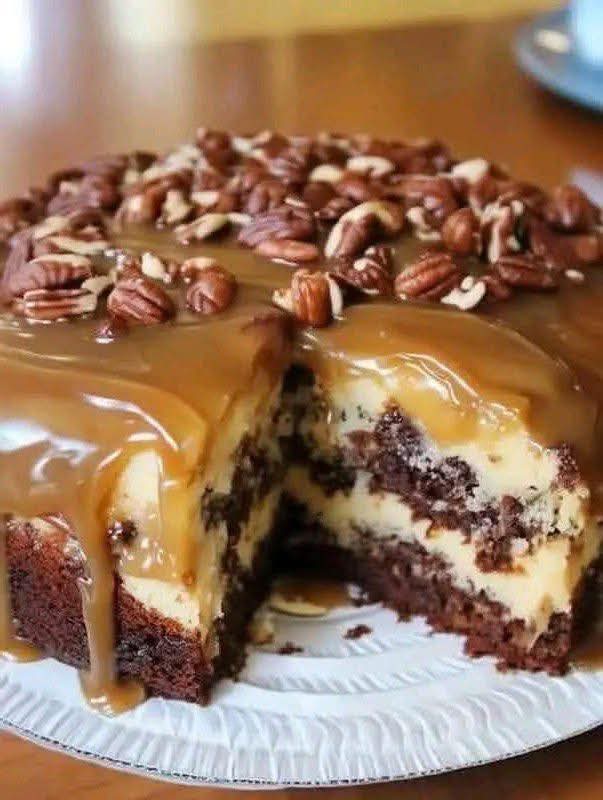 a luxurious combination of chocolate, caramel, and pecans—this cake transforms those beloved flavors